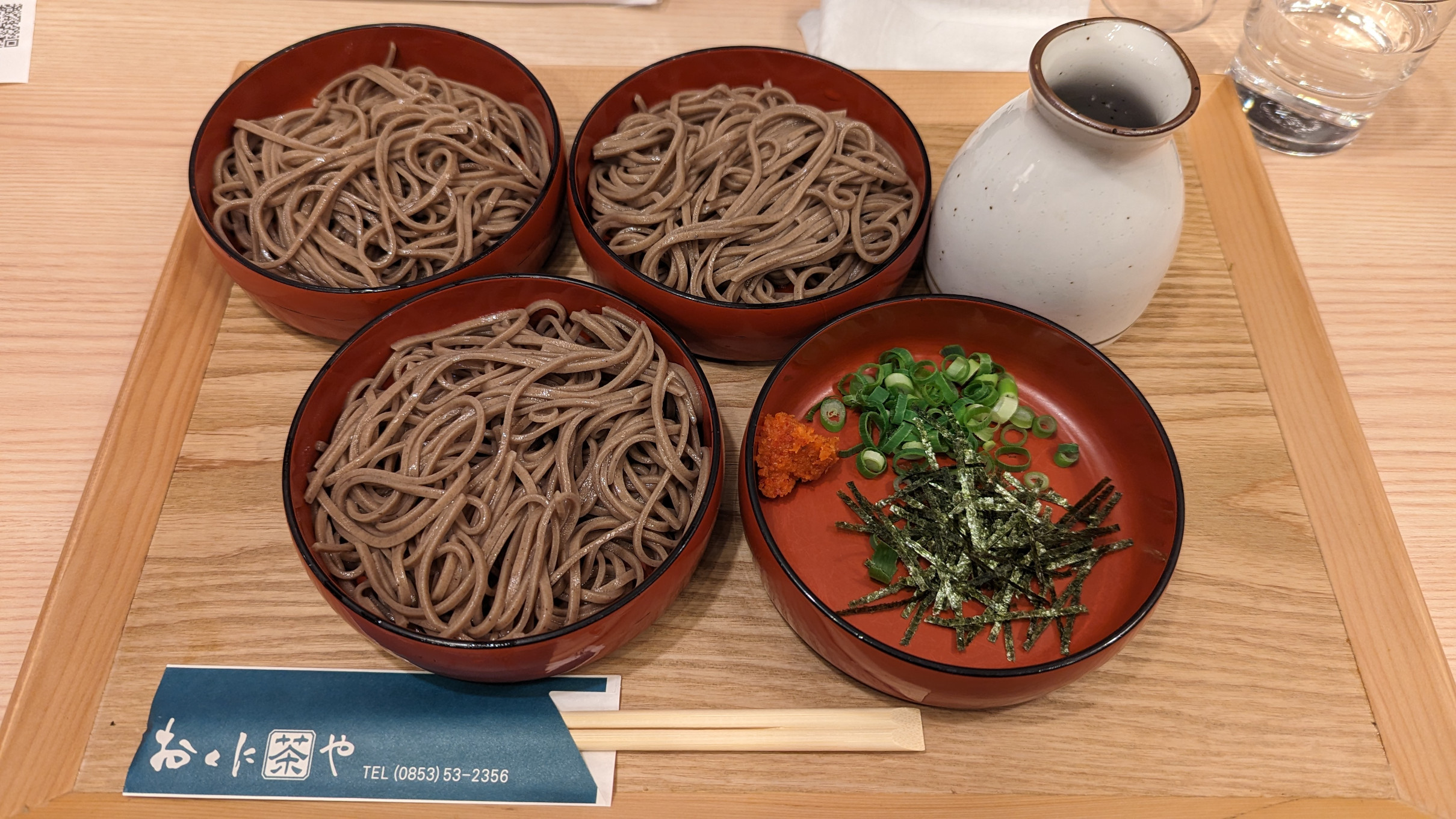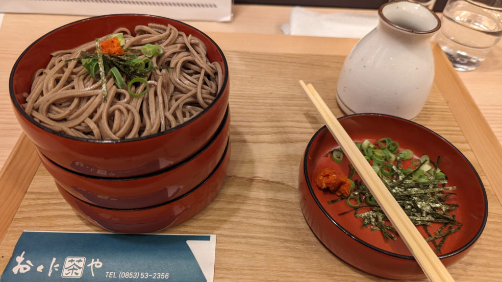 Wie es sich für einen wichtigen Schrein gehört, war dieser auch am 2. Januar brechend voll – Touristen, aber auch Japaner hatten sich hier versammelt, um für Glück und Gesundheit im neuen Jahr zu beten (oder eben Fotos zu machen und lecker zu essen). Es war wirklich beeindruckend, wie gigantisch das gesamte Gelände war. Wegen des neuen Jahres gab es auch ein paar Stände mit lecker Streetfood, doch wir wollten gerne Izumos Spezialität, Izumo Soba, essen. Anders als Soba normalerweise bekommt man hier gleich mehrere Schalen, in denen sich Nudeln befinden und die man stapelt. Dann garniert man die Nudeln ganz oben mit Soße und Toppings (meist Schnittlauch, Algen und anderes Kraut). Dann gießt man Soße dazu und isst – und wenn man die Nudeln gefuttert hat, gießt man die übriggebliebene Soße in die nächste Schale darunter und isst weiter, bis man unten angekommen ist. Ein interessantes Konzept, haha. Und lecker war es auch.